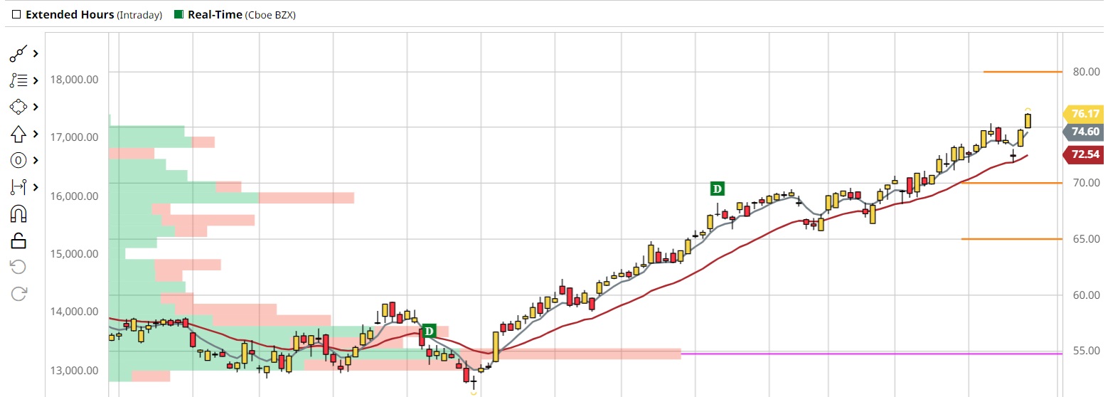 Se vende un contrato CALL 75 JUN recibiendo $2.70 por acción = $270 por contrato quedando la posición