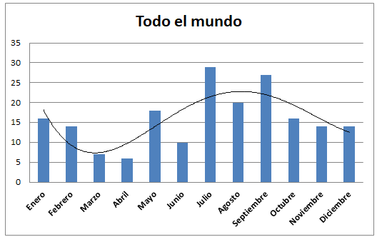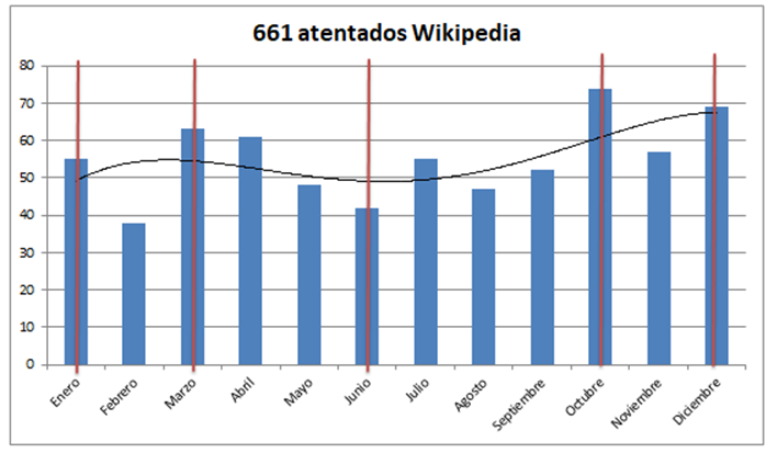 Además comprobamos el hecho de que los datos se reducen Junio y en Enero, y creamos una función polinómica de grado 4, ya que existen 2 equinococos y dos solsticios en 1 año. Función polinómica, que también se aproxima, si solo graficamos los 21 atetados terroristas con más víctimas de la web Statista.