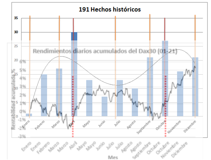 Y su utilidad en la bolsa, pues la misma que planteada en dicho artículo, y es que la sucesión de acontecimientos negativos concentrados en determinadas épocas del año, son los causantes de la posible estacionalidad vista en un índice de bolsa eficiente como lo es el S&P500 o en este caso el DAX40. Esto se deduce al comparar esa estacionalidad, con la sucesión de hechos históricos ordenados por meses. Ya que se denota una clara correlación negativa entre ambas.