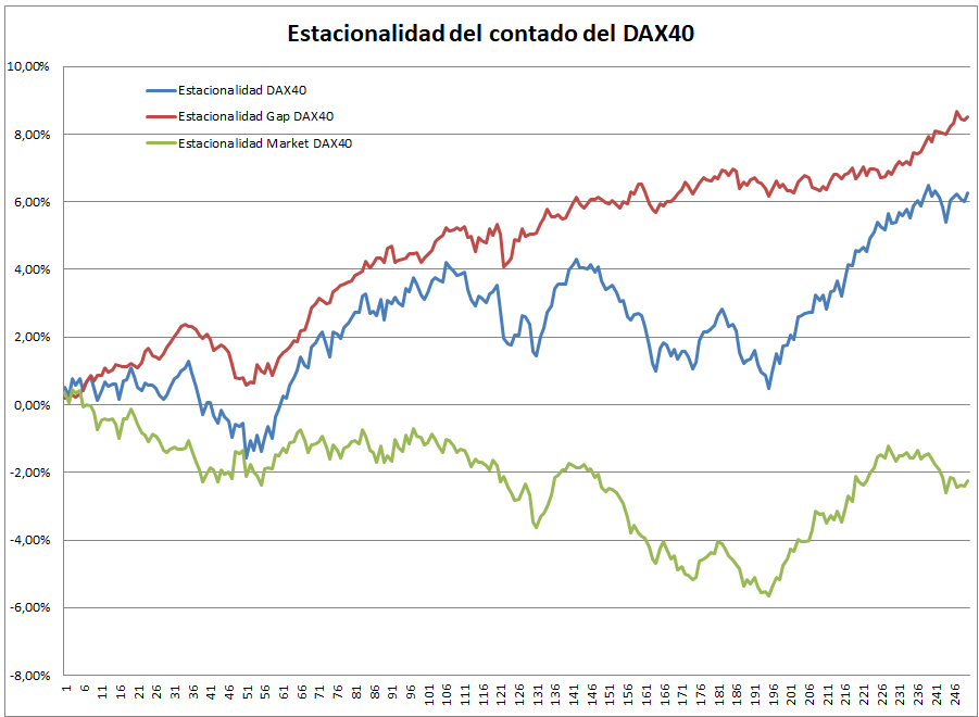 Una te la regalo, y la otra tienes que deducirá tu y el foro, de la foto que te mando y el hilo de este post. La que te regalo, supone una nueva forma de ver la estacionalidad de un índice bursátil, ya que compruebas como la estacionalidad del componente gap (precio de apertura n - precio cierre n-1), marca curiosamente los limites inferiores o superiores de tal estacionalidad ( a 20 años), en 2 índices tan potentes y eficientes como lo son el S&P500 y el DAX40 ( si añades el futuro, el resultado aún es mas impresionante.