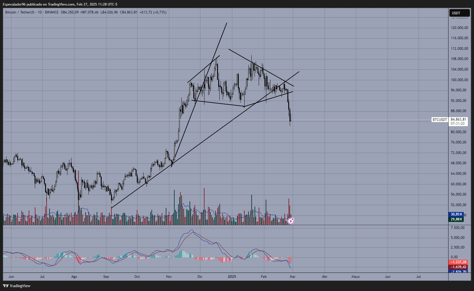 Nota adicional: El TP ya definí que debe buscarse en el límite de la formación, pero el SL aún no lo he definido. ¿Puedes ubicar el SL detrás del primer intento fallido de superar el máximo? Esto daría un buen ratio-riesgo beneficio y el SL también quedaría protegido por la compresión de precio. Creo que puede cuantificarse.