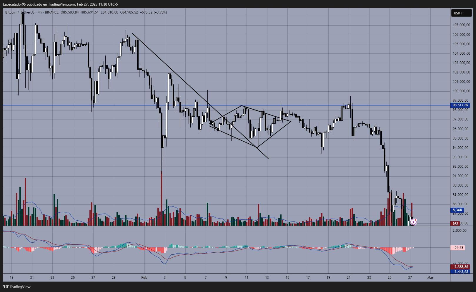 Necesitaría que claramente el precio muestre que se rompe la línea de tendencia. Generalmente un diamante lo hará de forma lateral. Acá te mando ejemplos. El diamante alcista no muestra la debida compresión, pero lo envío igual.Foréxitos escribió: 26 Feb 2025 23:05 ok Especulador.... centrémonos en el primer punto 1-Ruptura de línea de tendencia .... ahora sí, que es una línea de tendencia? cómo se forma? cuándo deja de serlo? todo tiene que quedar de forma objetiva.
