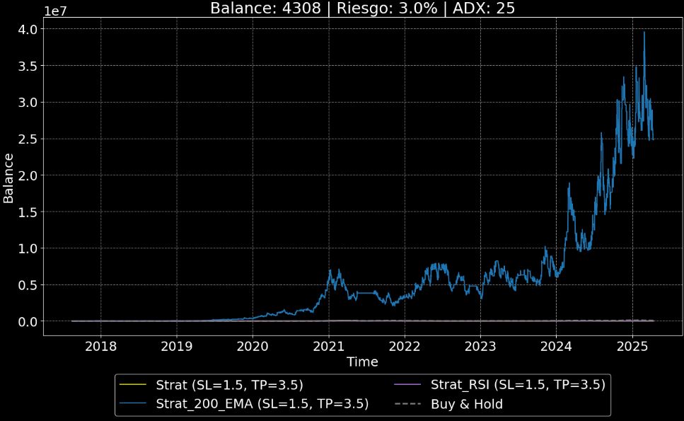 Estoy probando un código en python en Jupiter notebooks que usa Pandas le estoy metiendo datos de BTC y los resultados eran muy buenos, lo he estado evolucionando, ahora funciona en long y short, tiene trading fees (super importante!, muchas pruebas dejan de ser rentables con las fees), apalancamiento…, saca logs para diagnosticar y algunas cosas más