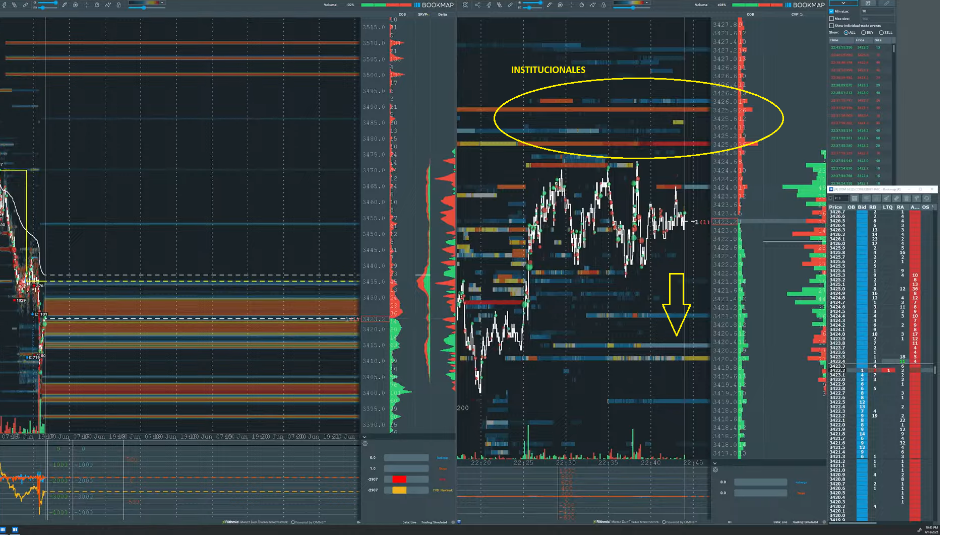 Para los que hacen operaciones de scalping, aqui les comparto una breve captura de la herramienta BOOKMAP, excelente software para detectar los institucionales y aprovechar la breve posicion de ellos y poder afianzar nuestras operaciones, en el gafico podemos ver que los pulpos estan por encima de nosotros, y empujaran el mercado hacia abajo..........