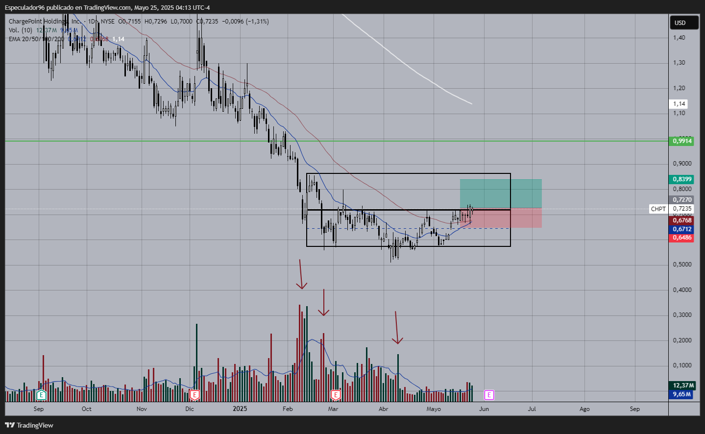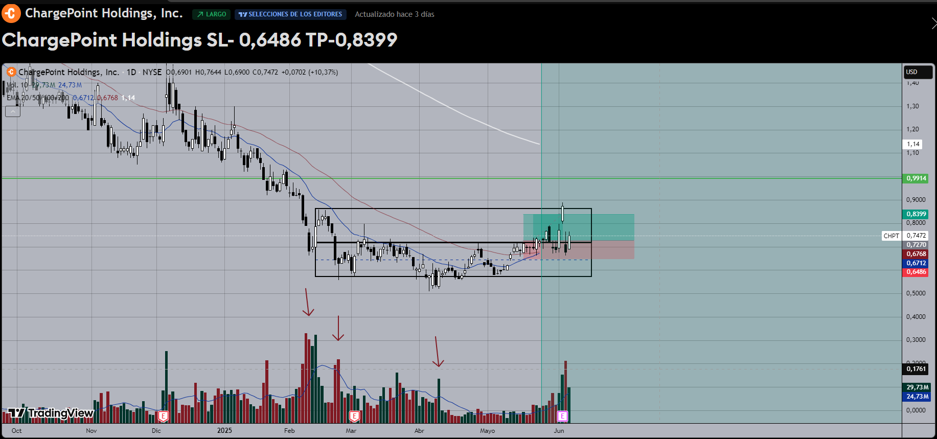 No me interesa si la empresa se salva. Soy analista técnico y detecté participación institucional en los gráficos de cotizaciones. Considero que los directivos y los accionistas de la empresa van a hacer todo lo posible por subir el valor de ChargePoint por encima de $1 y mantenerlo, para que no sea deslistada de NYSE. Con un precio objetivo tan discreto, solo basta con que lo intenten para poder generar un 15% de ganancias del punto A al punto B en los próximos días. La última palabra la tendrá el mercado.