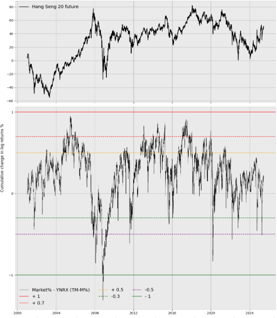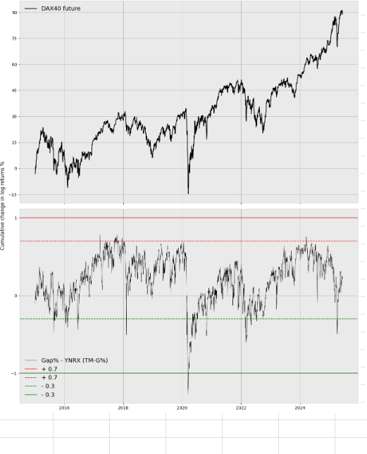 Las líneas que veíamos al principio (modelo Yanirax (YNRX), Minijefa (MBI) y RSG, aplicados sobre un índice de volatilidad implícita), y que marcaban los mínimos de mercado de los activos analizados, parecen siempre oscilar entre un rango de 1 y -1, y muy especialmente entre 0,7 y -0,3.