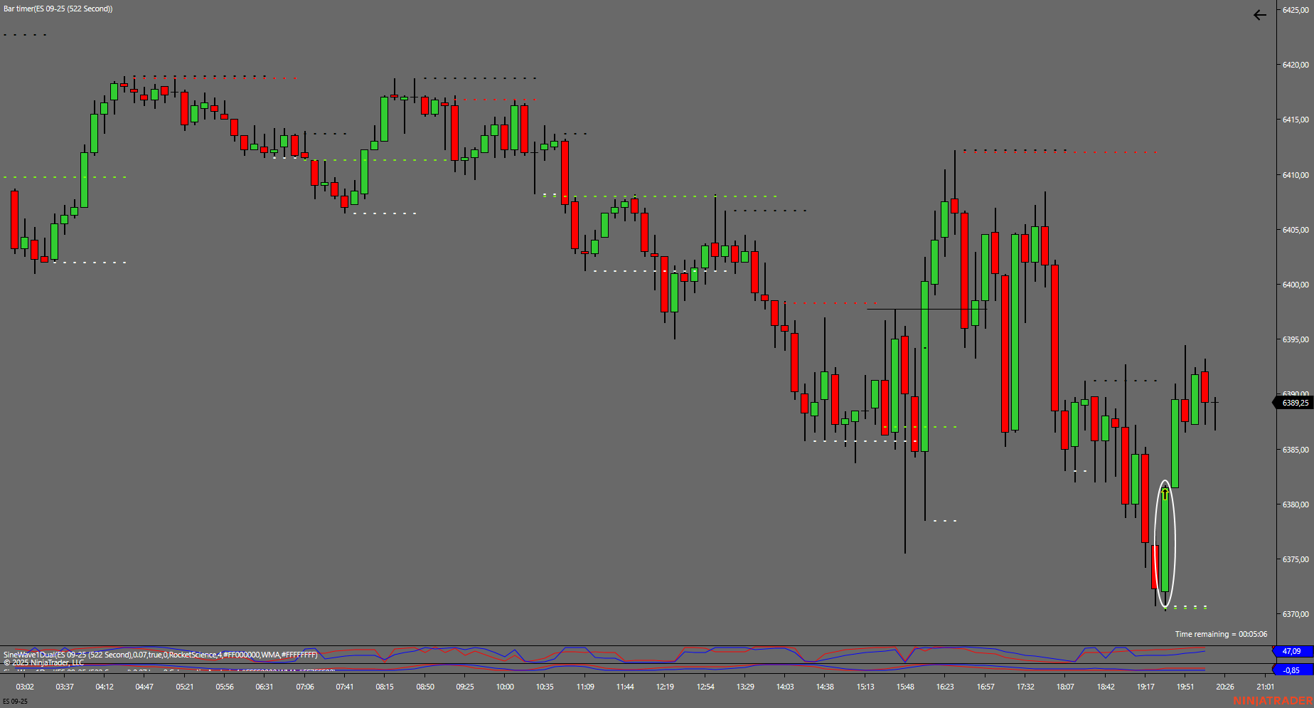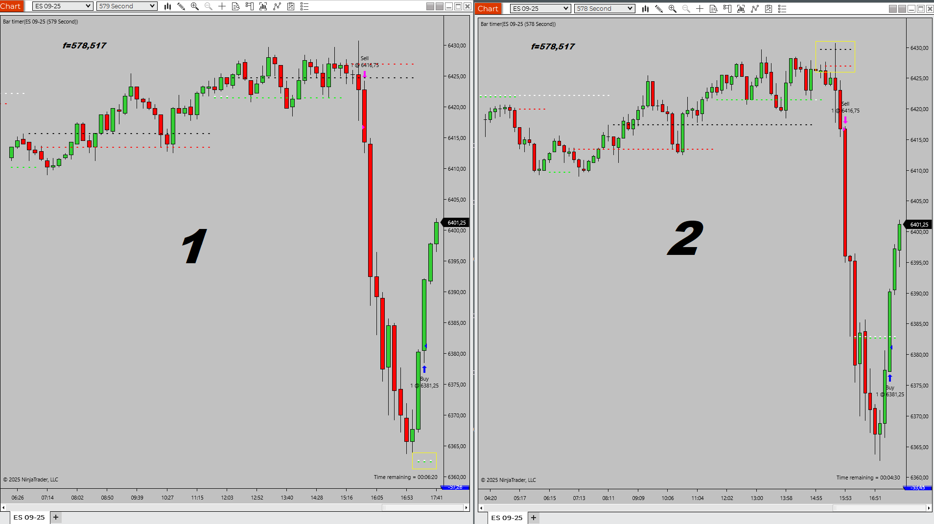 Ninjatrader y otras plataformas de graficación lo hacen en segundos y al no tener acceso a una graficación en al menos centésimas de segundo, no hay más remedio que abrir dos gráficos al redondeo por encima y por debajo, en este caso uno de 578 y otro de 579 segundos, etiquetadas como 1 y 2 en la captura.