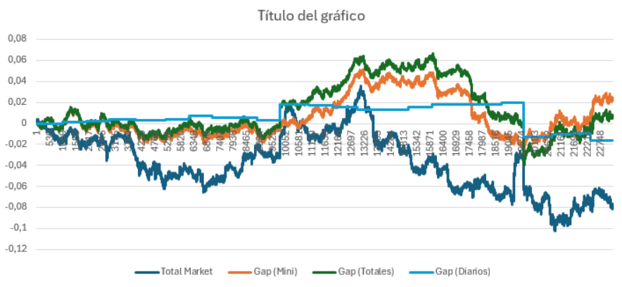 Los resultados que vemos en las gráficas anteriores, son consistentes con la bibliografía académica existente,, ya que la tendencia de los gaps entre velas de 1 minuto en valor acumulado, siguen la misma evolución del mercado (cosa que no tiene porque hacer el gap de apertura en times frames de 1D). Eso ya se ha demostrado.