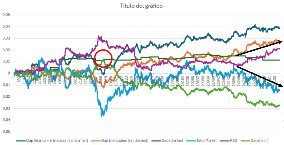 Los resultados que vemos en las gráficas anteriores, son consistentes con la bibliografía académica existente,, ya que la tendencia de los gaps entre velas de 1 minuto en valor acumulado, siguen la misma evolución del mercado (cosa que no tiene porque hacer el gap de apertura en times frames de 1D). Eso ya se ha demostrado.