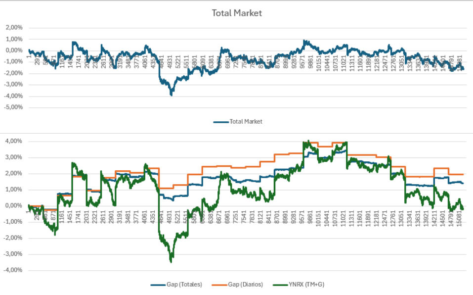 Para demostrar esta afirmación, se construye los componentes Market, Total Market, así como los modelos YNRX, MBI y RSG, con la data a 1 minuto de Trading View sobre el futuro del DAX40 (EUREX), en el máximo histórico de datos que me permite descargar la plataforma, osea desde el 21/07/2025 y en mas de 24.000 observaciones minutales