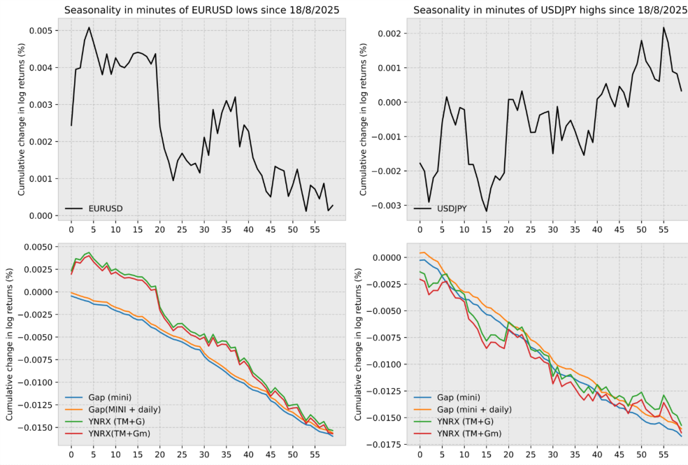 Cómo puede la Miniestructura detectar desde el 18 de agosto los máximos del EURUSD y los mínimos del USDJPY, pero al estacionalizar esos dos pares de divisas y sus modelos, detectar los mínimos estacionales del EURUSD y los máximos del USDJPY