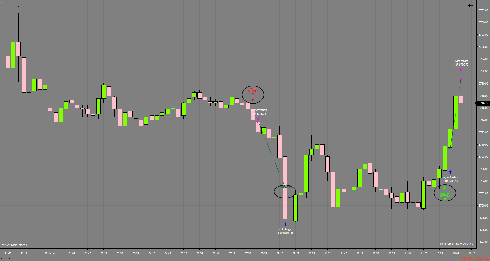 Continua el corto (venta) de ayer en 6741.5 que es el precio real respecto a la captura del día de hoy, ya que al tener un TimeFrame exacto cada día y al ser diferente de un día a otro, puede no verse en el mismo nivel de precio, pero para ver el precio donde ejecutó la entrada corta , solo hay que ver la captura de ayer.