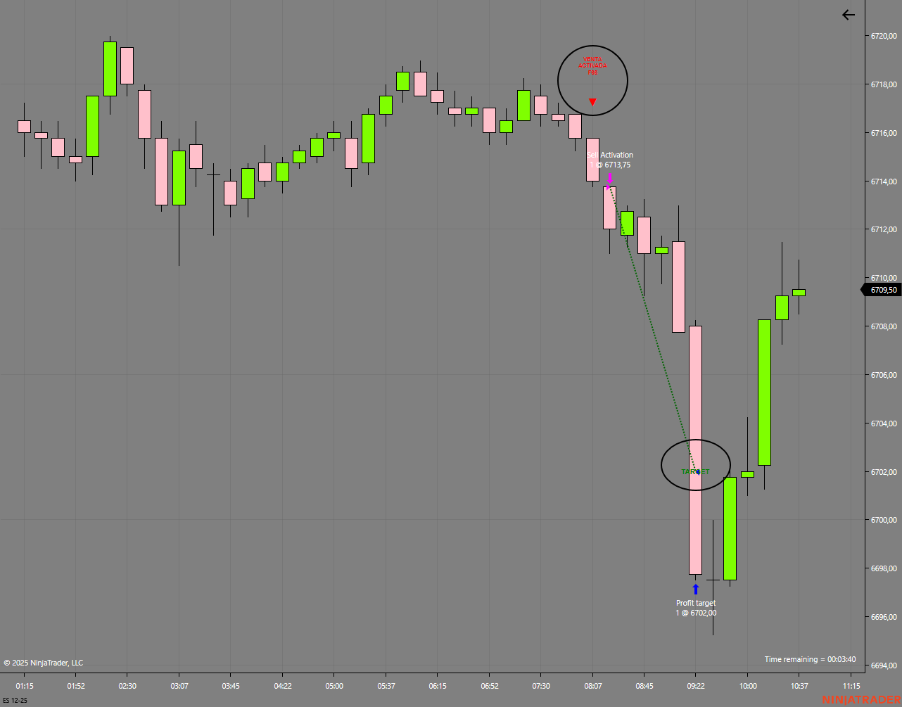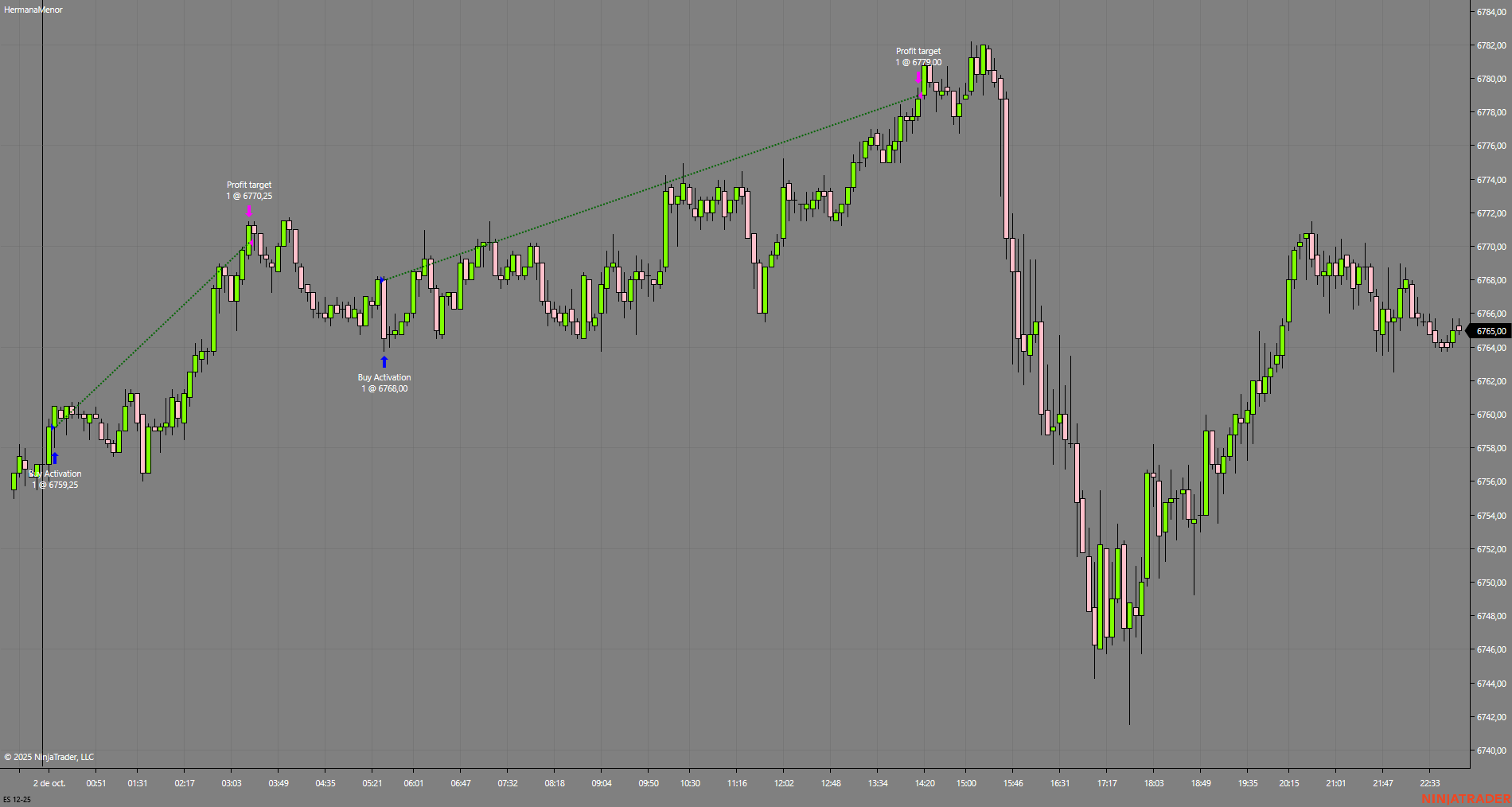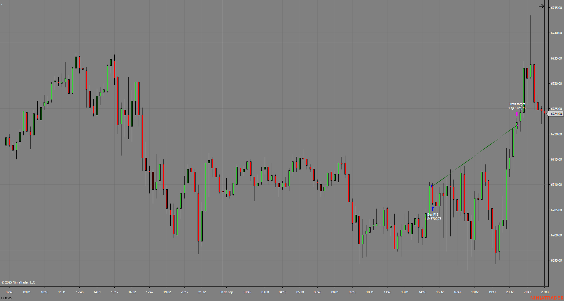 Continua el corto (venta) de ayer en 6741.5 que es el precio real respecto a la captura del día de hoy, ya que al tener un TimeFrame exacto cada día y al ser diferente de un día a otro, puede no verse en el mismo nivel de precio, pero para ver el precio donde ejecutó la entrada corta , solo hay que ver la captura de ayer.