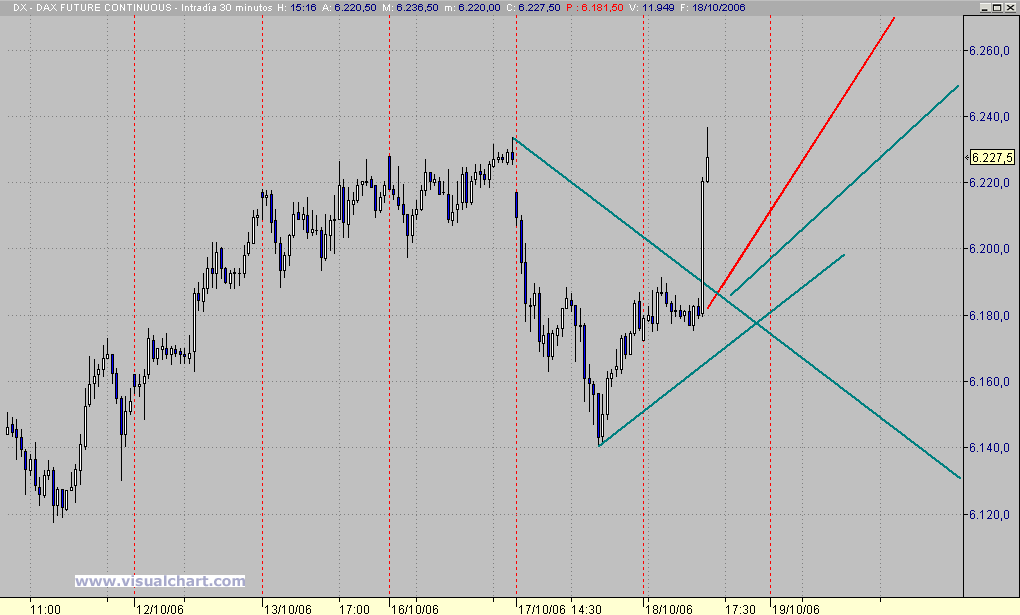 Hola Dkvas, pues coincidimos mucho en el analisis, he abierto corto con puts compradas, y ahora que me ha hecho giro al alza, he comprado futuros del stxx en 81-82 para subirlos hasta que el Dax me haga 6190-6200, en ese momento cerraré los futuros largos y a ver si las puts compradas bajan a la zona de 6050. El stop para esas puts superacion del maximo de 6230.