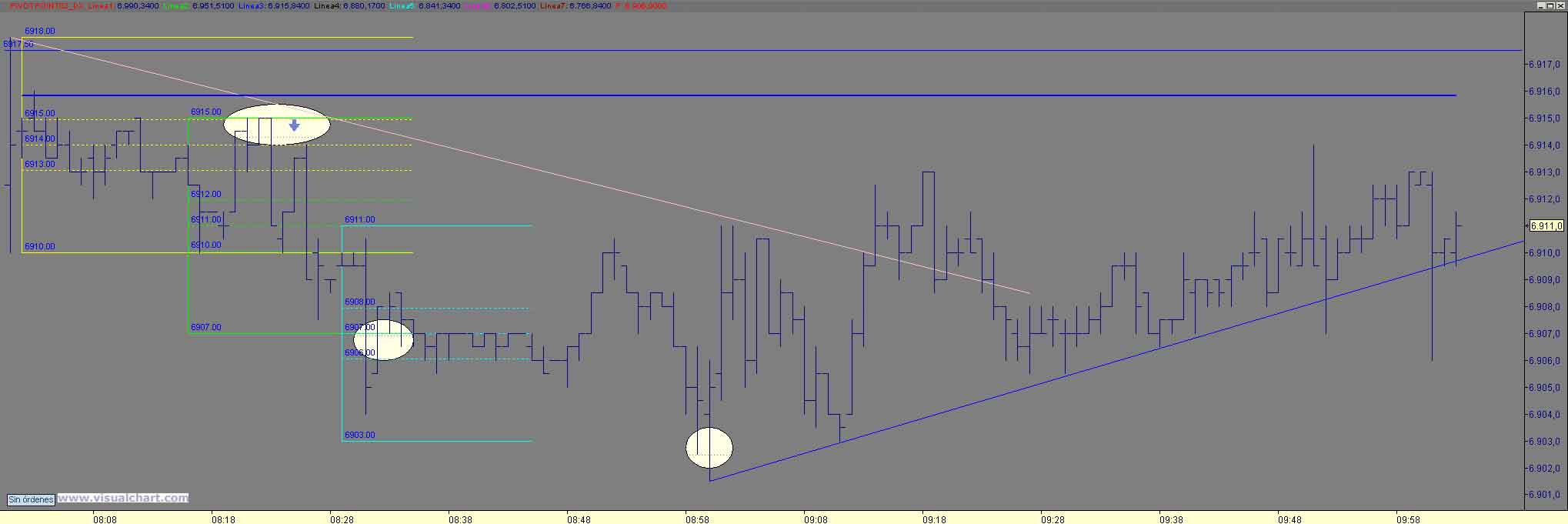 Vamos con la primera de la mañana gap matinal a los maximos de ayer y donde el precio giro nivel 17 19 con lo cual punto de ref claro por arriba evidentemente todo lo que no sea superar ese nivel son señal de cortos amen de la ref clara del nivel de R1 de pivot 6916 y los primeros cortos los puso facil con ese mov en retro al 61 de Fibo 6915 con obj 6907 y 6903 nivel anterior de control en la operativa de ayer por la tarde Saludos