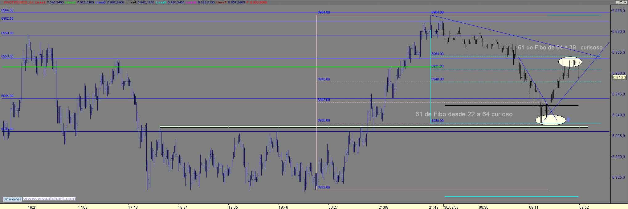 Nuestro Dax paro en sus puntos claves y nos dio opcion de unos larguitos en............curioso 61% de toda la subida hasta su siguiente nivel de control de ayer el 6953 que curioso.......... es el 61 de Fibo desde max minimo de hoy Saludos