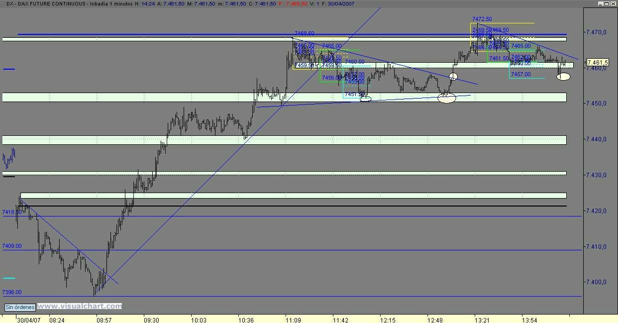 Me parecen cojonudas las explicaciones de Bimojim pero poco prácticas. Me explico: es muy fácil pintar retrocesos y proyectar objetivos con un mínimo de conocimiento sobre análisis técnico, pero ya no lo es tanto cuando esas decisiones hay que tomarlas en tiempo real. Cuando llegue ese momento se desvanecerá el castillo de naipes. No pongo en duda que él pueda poner en práctica esa operativa jugando con Stops de 1 a 4 puntos, lo que permite aspirar a ratios envidiables en cualquier estrategia, ya sea automática o manual, pero no nos engañemos, si ya resulta difícil operar con el DAX con stops más amplios, imaginaros el nudo en el estómago cada vez que toca abrir posición. Suaviza algo la tensión el hecho de que nos jugamos unos ridículos 4 puntos, pero 4 puntos ahora, 4 más tarde y los 20, 30 ó 50 que dejaremos de ganar las veces que nos quedemos bloqueados y no abramos posición, minarán la moral al más crédulo.