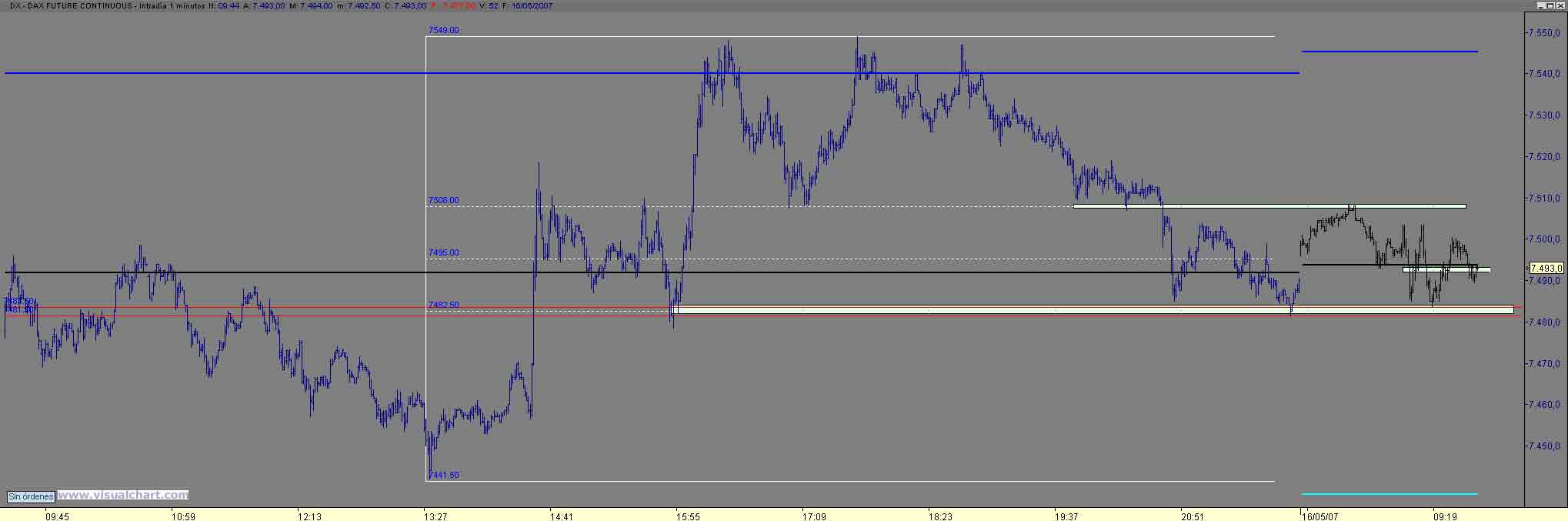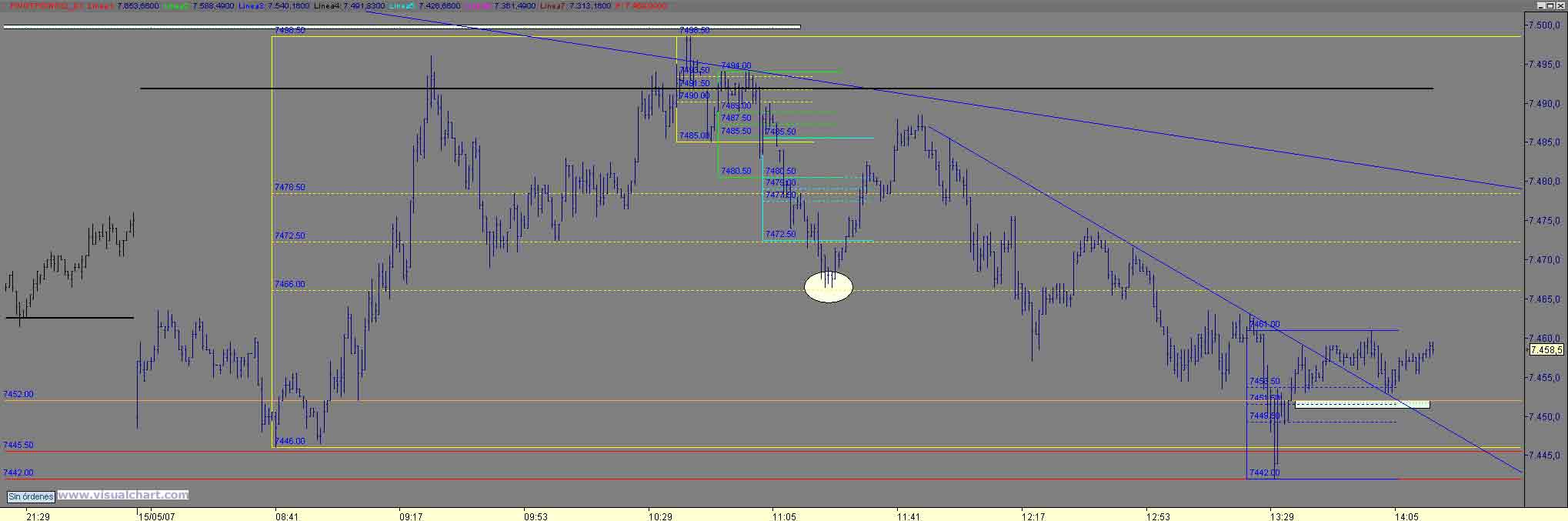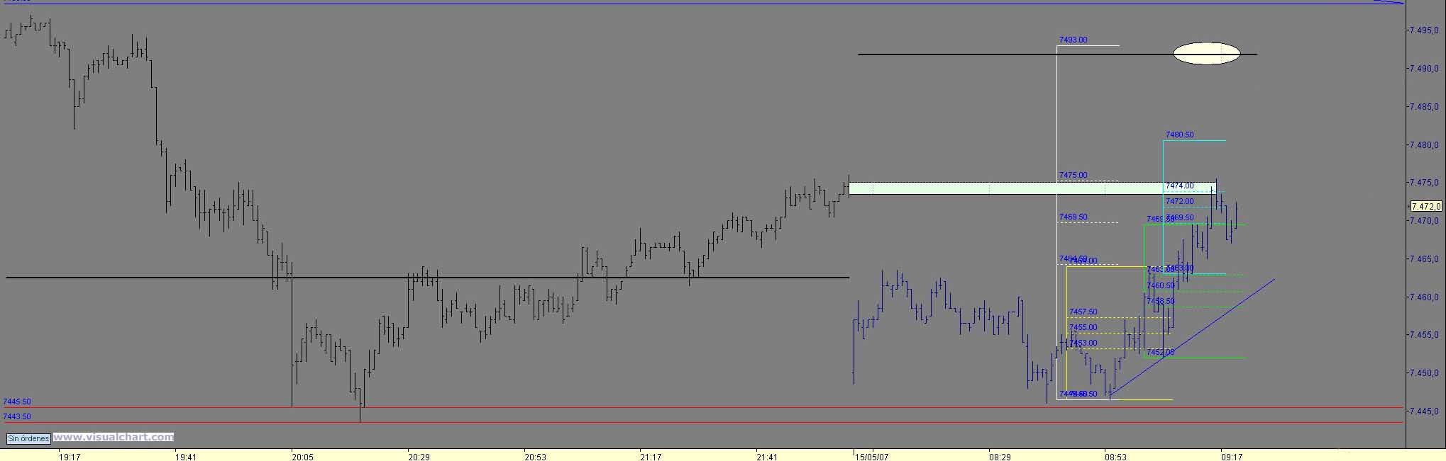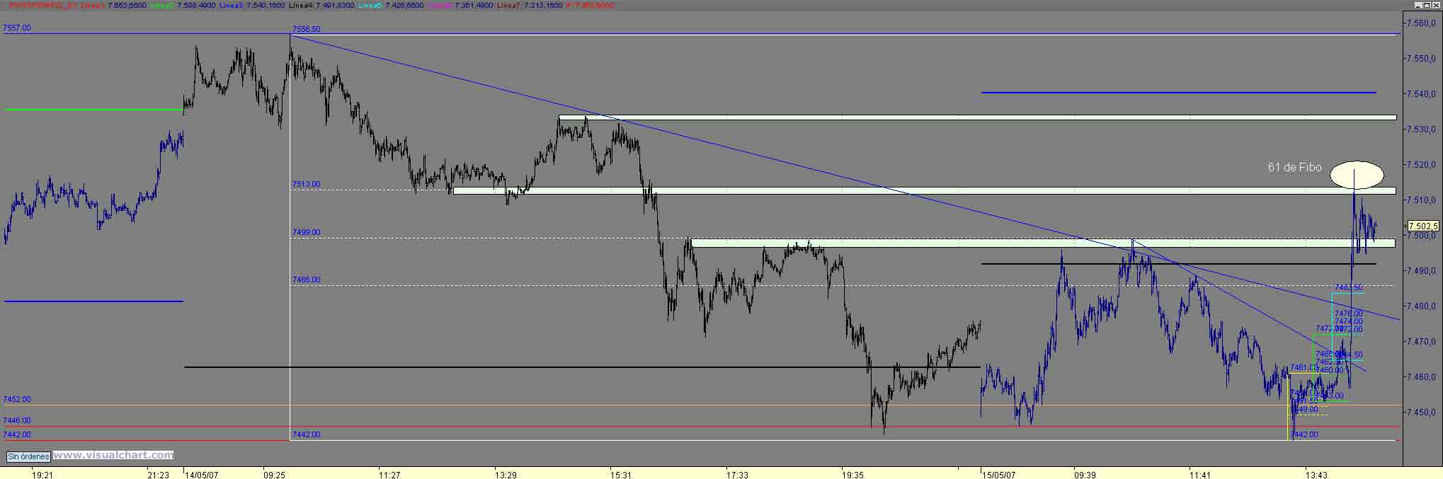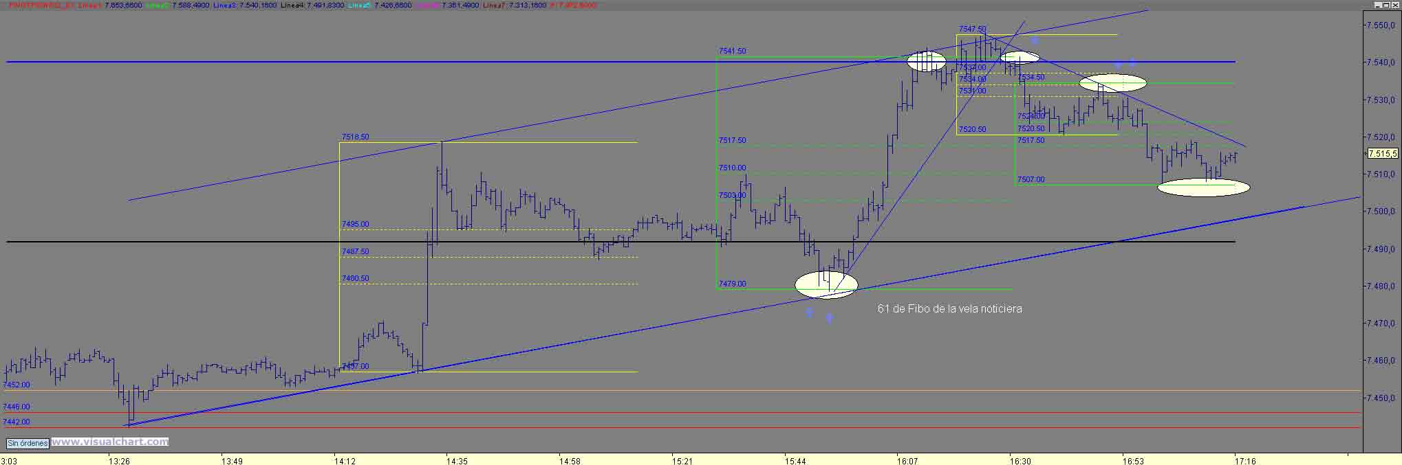 Pues compramos cupon y hoy parece que no tenian ganas de barrer (claro es festivo) y lo pusieron facil buscando los largos rn 60 para bajarnos en el 95 aunque si os dais cuenta llego aunque no cerro al 61 de Fibo de todo el movimiento desde el 7556.50 al 7442 donde el impulso creado con retro al 7510.50 nos da obj 87 veremos , no descarto que llegue al 80 que el 61 de Fibo del velon noticiero Saludos