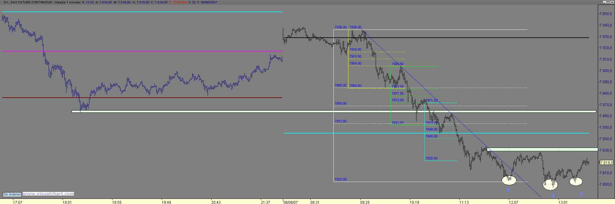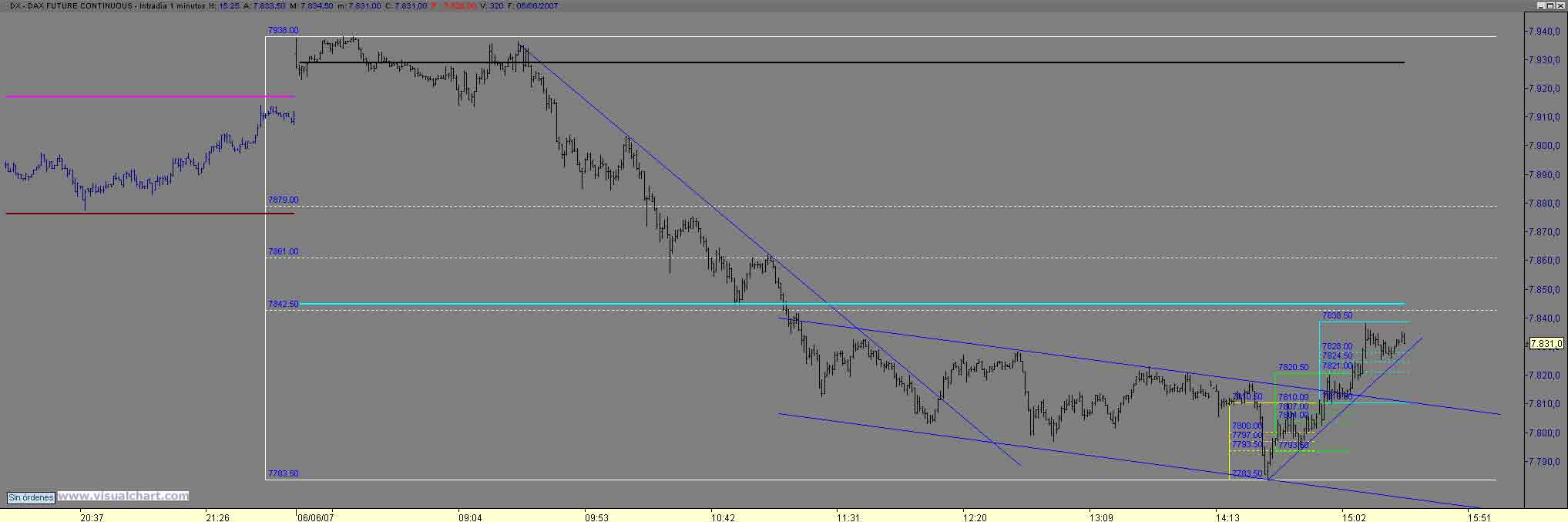 Muy bueno dias, hoy nuestro amigo el Dax se desperto con gap alcista siguiendo con la estela de ayer a ultima hora, aunque la no superacion del 37 38 (50 de Fibo del movimiento de ayer) dio opcion a unos cortos en tres impulsos hasta el nivel de cierre del gap y zona de control 7912 7914 que ademas se me antoja clave para mantener el tipo alcista desde esa zona hasta el 7948 7951 donde realmente esta el meollo de la cuestion Saludos