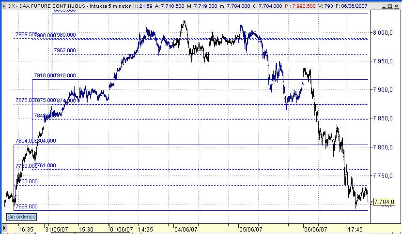 Y continuando con nuestro amigo el DAX pues mirar el graf en 30m cuando esta mañana comentaba que el 7938 era el 50% de Fibo del movimeinto del dia anterior la que nos estaba preparando (yo desde luego no lo pensaba) pero se fue a cumplir su obj de 3 (7693.50) que ademas es zona de control anterior (7675 7690) y deja tocado del ala la direztriz alcista desde el doble suelo en 6424 para mañana la disyuntiva es por abajo ver el 7570 7580 y por arriba volvel al 7800 asique a pensar esta noche Saludos