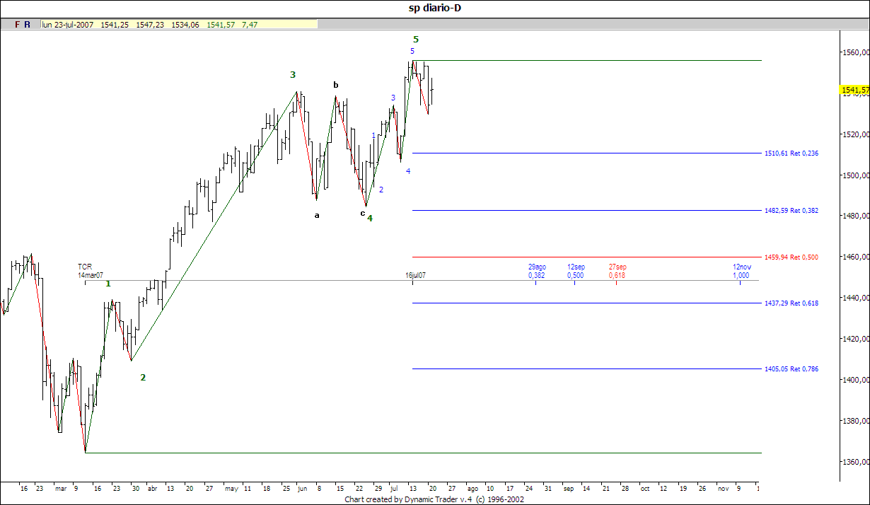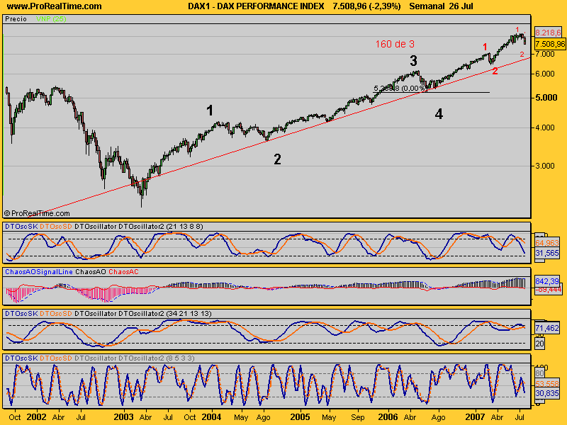 lo malo del recuento es que la solución está a la derecha, en ese maldito espacio que está en blanco cuando tú lo haces. Pero también es lo bueno: como leí a un forero de cuyo nombre no me acuerdo, aunque quiero, la incertidumbre es lo que hace que esto valga, sin incertidumbre no hay posibilidad de especular. El elliotwave ese de marras es mogollón de divertido, pero me fío de él lo mismo que de un banco fundado por el Dioni. De hecho el recuento del Dax era diferente en el gráfico diario, semanal y mensual. El del diario era cañero, la 1ª onda duraba hasta el 2006 (mayo) y la 3 se acababa en diciembre