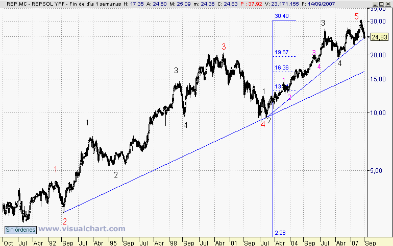 En el gráfico diario, parece que REPSOL ha cortado la línea 2-4 de la Onda 5, (en color fucsia), que parece ser la última de la subida que se inició en Mayo de 2006, (Onda 4 en color negro), sobre los 19, 50 Euros.
