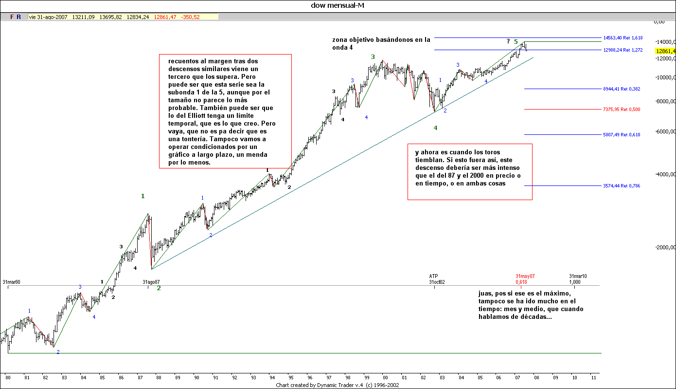 A tan largo plazo no sé si creer en el módulo de Elliott, casi me parece exagerao, pero le tengo respeto. Pero ya que nos ponemos así de elucubrantes, lo cual es muy divertido, pues me voy a atrever a poner mi recuento mensual del Dow, que, mira por donde, encaja bastante bien con tu recuento de Repsol a la hora de pintar un panorama negro, negro...aunque no deja de tener aires de ciencia ficción.