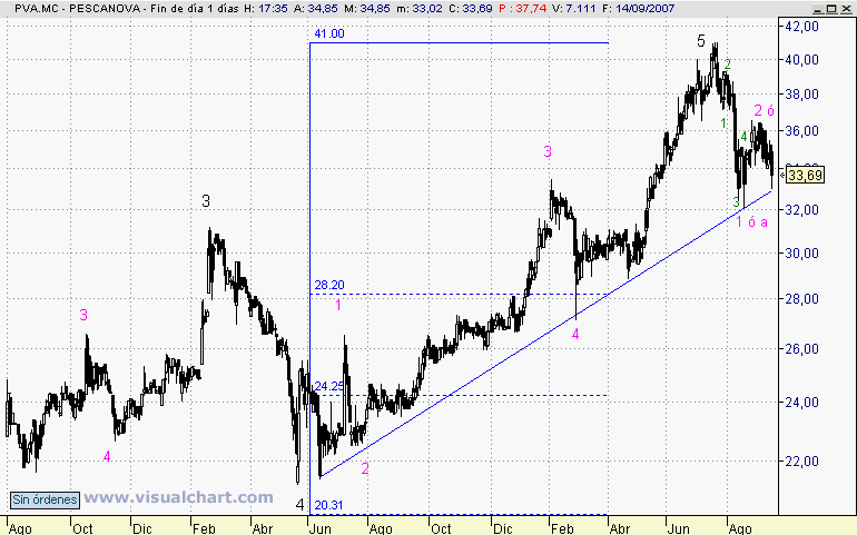 En este gráfico diario lo que se puede comprobar es que ésta última caída que comenzó el 9 de Julio, sobre 30 Euros, parece impulsiva por su inclinación.