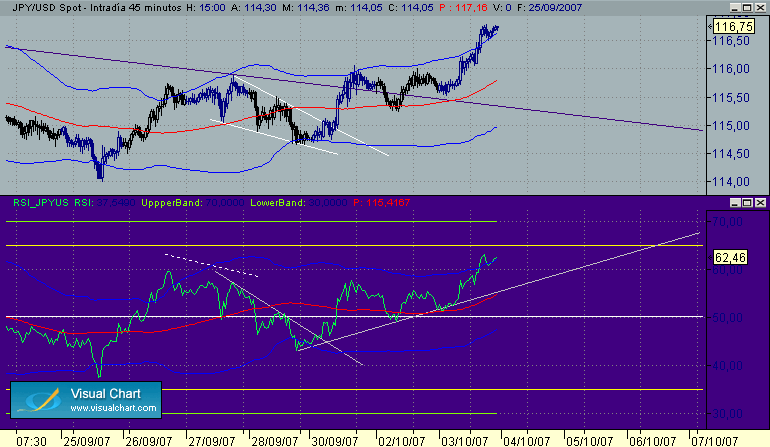1º Toke a la directriz y forma divergencia ......100 pipos pabajo y al bajar forma cuña apoyandose en banda exterior baja bollinger en 45, el rsi corta su linea y el rebote esta servido, ahi piensa que stop necesitas........ muy poco, esas figuras de cuña ...........