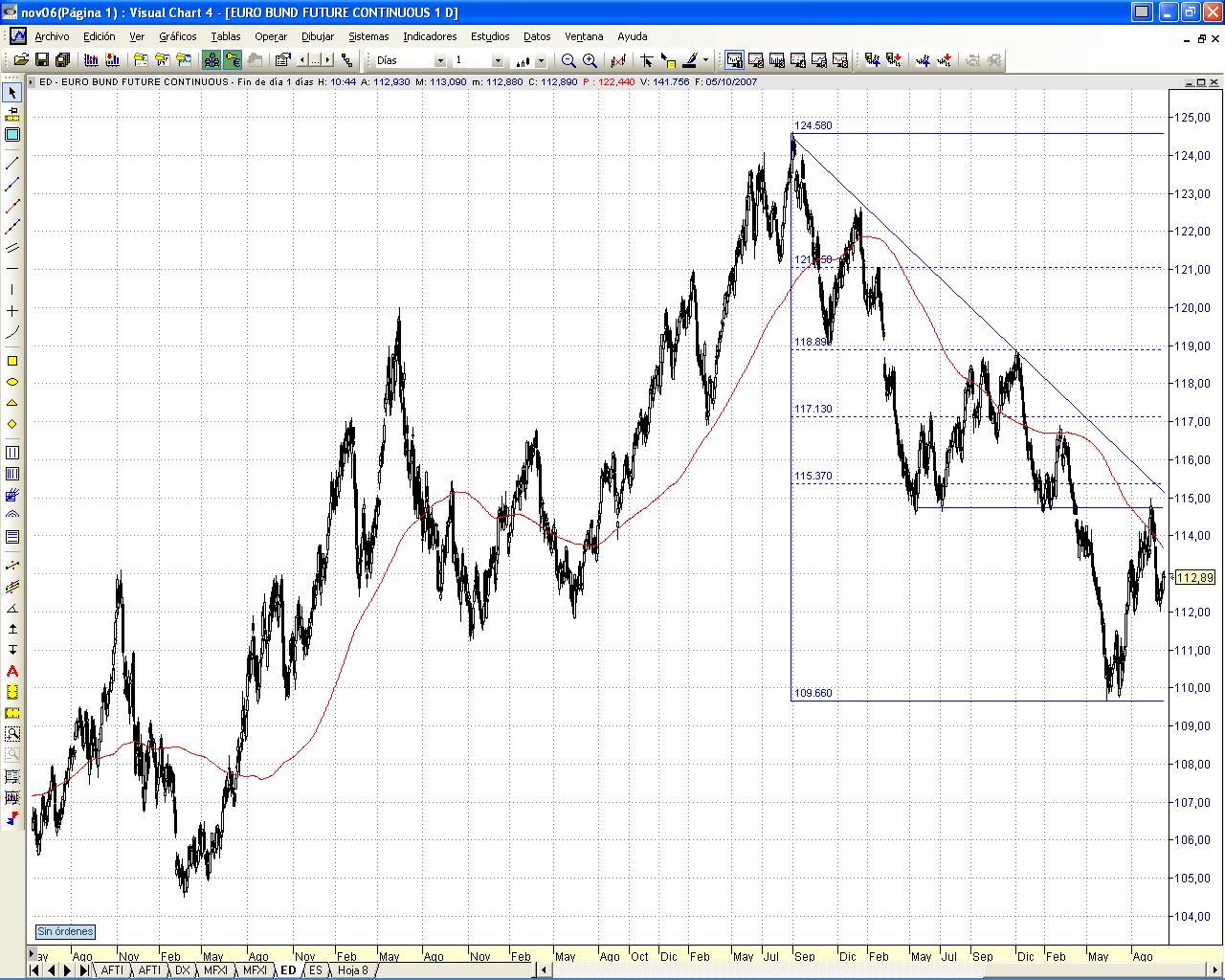 Como puedes ver en el gráfico lque adjunto la tendencia del bono es bajista, no hace falta ser un lince para verlo, el último impulso dentro de la tendencia principal se detuvo alrededor de 110, con lo que queda esta zona como soporte principal de mercado.