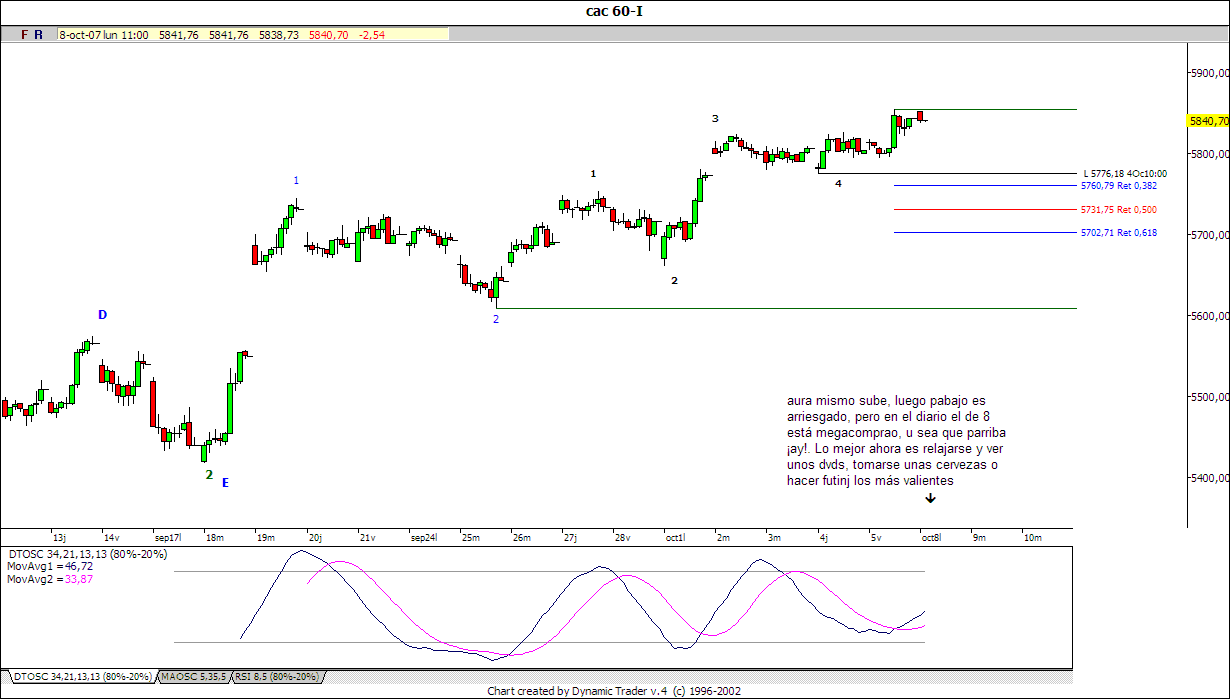 Como el mercadillo está aburrido y extrañamente me rula el euro dolar (llevo 1 semana en Visual Chart y este es el 2º día que me va, tiene webs la cosa) me he entretenido con el bicho. Al final hizo un cierre por debajo del mínimo del día del máximo ( señal muy buena esta cuando está en objetivos) pero no menteré gracias a la susodicha teknología punta sin "n". Pero no creo que sea tanto una oportunidad de venta (pal que se haya metido rápido sí) como lo va a ser de compra pues me paice que el tope es el final de una tercera y no va a retroceder allavaquetevá ya que esta extendió la quinta. Ahí van unos retrocesos desos. No creo que la corrección esté terminada. Enfins.