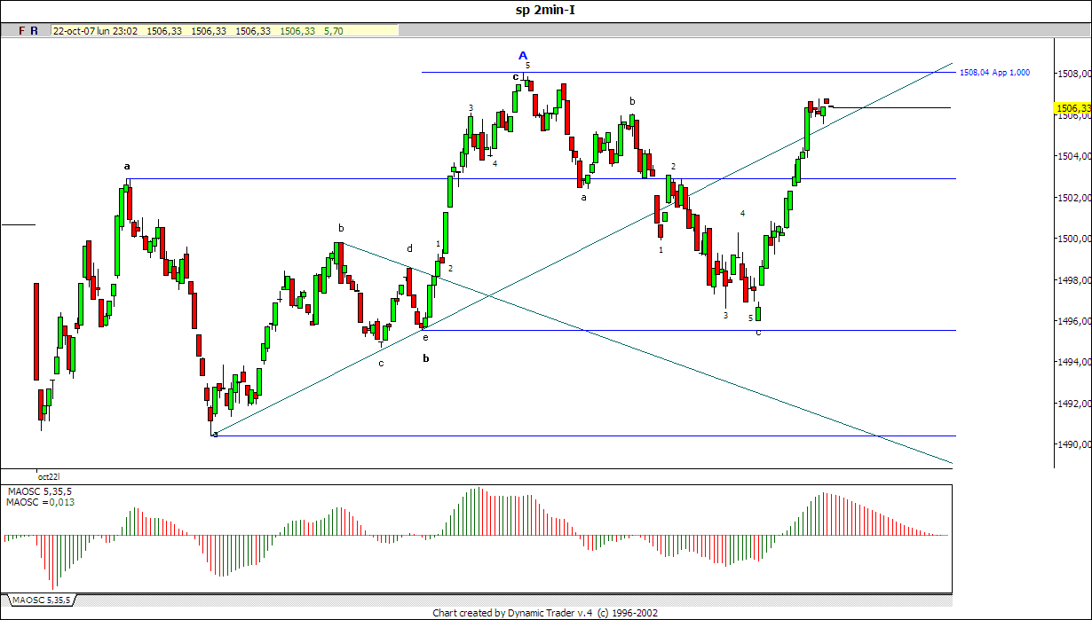 Vaya fallo. Creo que el fondo es la 5, ya que lleva demasiao tiempo gastado y precio para ser una subonda. Lo despistante es porque creo que el ascenso está siendo correctivo, pero tardará unos días en petar. A ver si entramos largos. Joer, si tenía pensao meterme largo en cuanto viera muchos rojos esta mañana. Y me lo he pensao y no me he atrevido cuando he visto el dow en -100. ¡seré capullo! Ultimamente parezco Pier Nodoyuna.