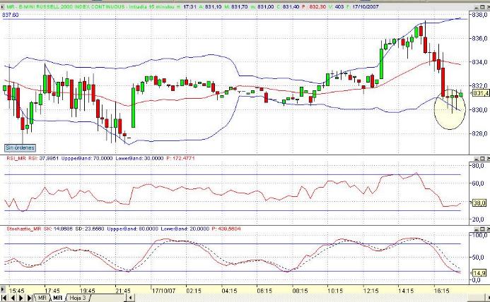 Figura de vuelta en grafico de 15 minutos en el russell, tres hammer seguidos, y objetivo pues la parte alta del precio del dia. Veremos si lo hace, de momento entrada 830,8 y stop en 829,5