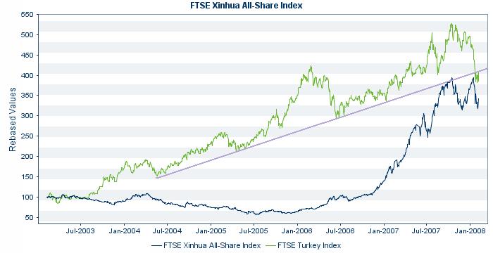 Lo del casino es bastante cierto, pero me refería al Xinhua 25 y no al Xinhua All Shares. El Xinhua 25, que está replicado por el ETF FXI, está menos influenciado por la vorágine compradora de los chinos, más bien está movida por los occidentales, ya que la mayor parte de las acciones en circulación están en manos de fondos de gestoras internacionales, léase China Mobile, PetroChina, etc. a través de los ADR. El All Shares se ha convertido un poco en una casa de Geishas, como se ha venido viendo en las sucesivas OPVs de este año, que han sido im-presionantes. Además apuntaría que en momentos de crecimiento tan bestial, son los grandes los que acumulan músculo financiero, así que a por ellos... los chicharros para los chinos.