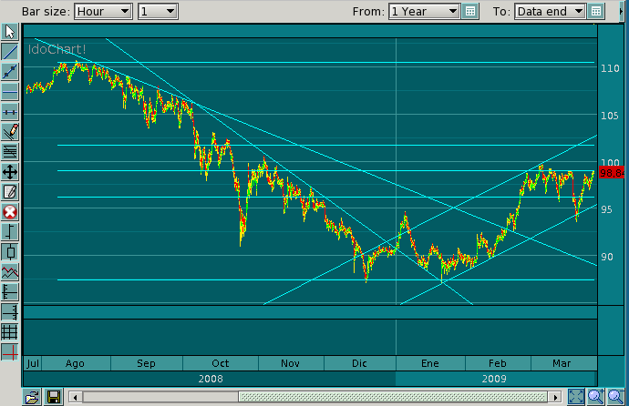 El USD/JPY ha recuperado el tortazo que se pegó el 18 y 19 de Marzo como consecuencia de los anuncios de compra de deuda Yankee. Parece interesante ver cómo el tortazo del USD frente al EUR, se mantiene, pero frente al JPY ya se ha recuperado.