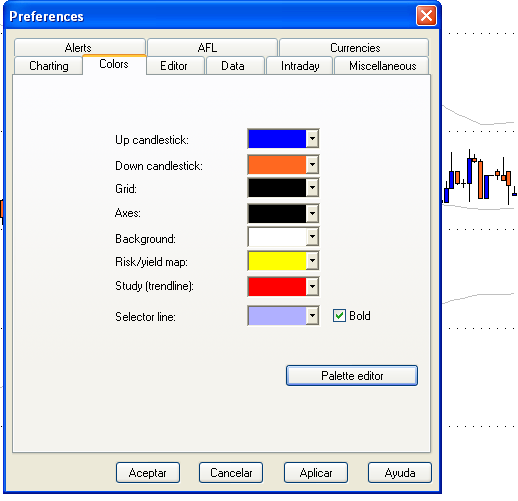 JMVMRGR escribió: - Puedes dar a las velas el color que quieres, por ejemplo azul para las velas alcistas y naranja para las bajistas, ¿Como puedes lograr esto en amibroker?