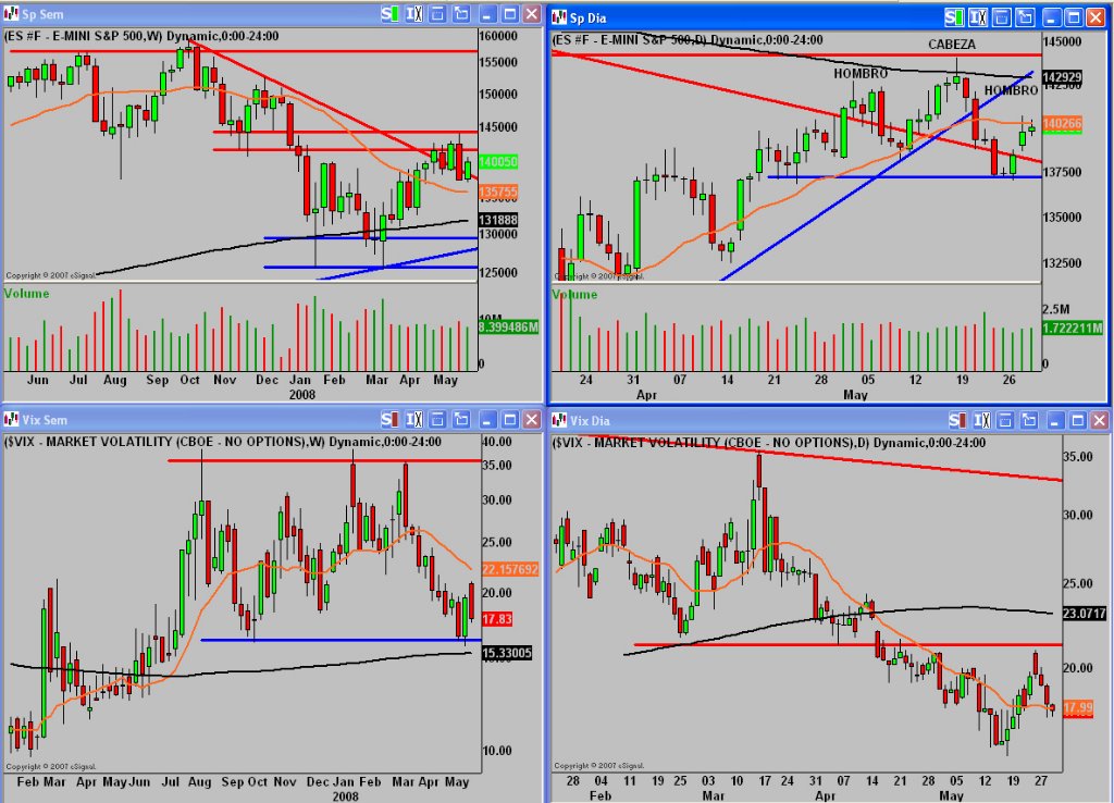 Por lo tanto mucha precaución, ajustar stops en posiciones largas y recordar que la tendencia primaria es bajista por lo que este rebote aunque uno tenga el deseo de que se prolongue, bien podría estar llegando a su fin. Respecto al Vix , tenemos al igual que en precio, la misma divergencia con un patrón de compra en semanal que nos estaría indicando precios menores y un patrón de venta en diario que bien podría indicar la formación del primer mínimo creciente en diario.