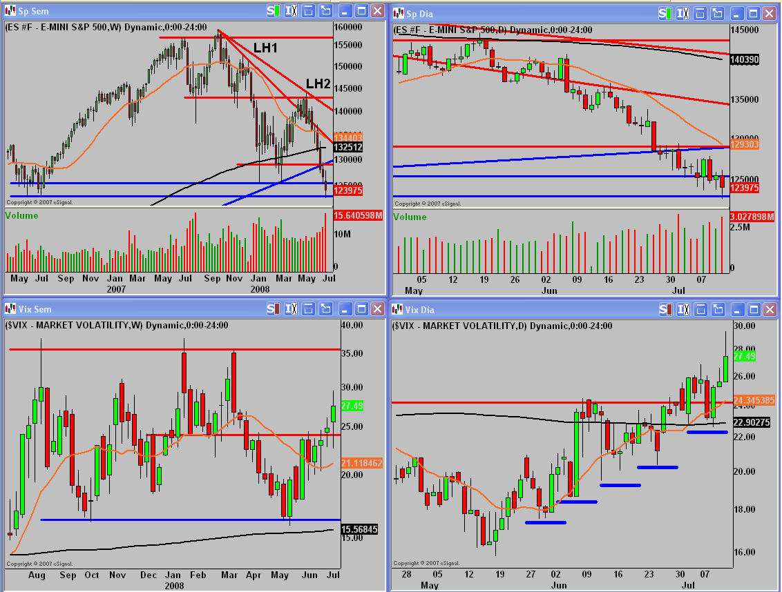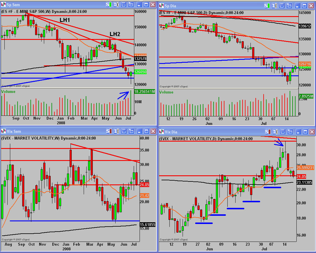 Los gráficos tienen poco nuevo que decir. El movimiento extendido a la baja, hace suponer que tras 8 semanas haciendo máximos y mínimos decrecientes, el movimiento que tiene caracteristicas de culminante, está a punto de llegar a su climax. A favor de esta teoría está el volumen semanal al cierre que por lo que se puede observar en el gráfico supone el mayor en lo que llevamos de año, por lo que adquiere la condición de culminante. Además la parte baja del soporte mayor, 1230, aguantó el viernes a precios de cierre, los ataques de los Osos.