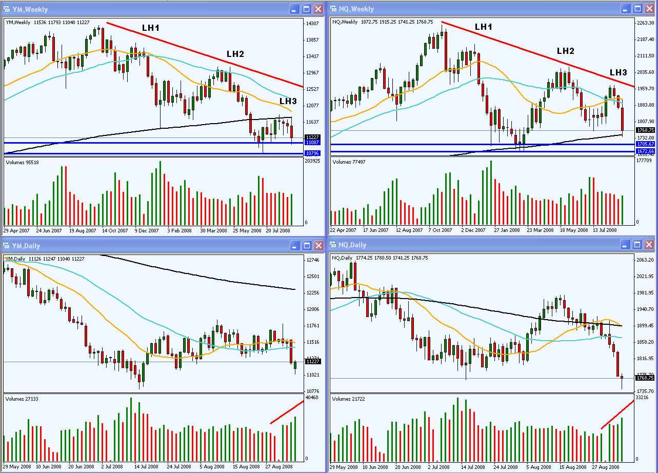 El gráfico semanal marca la formación de un primer mínimo mayor que debería confirmarse a lo largo de la semana. Sin adelantar acontecimientos, en caso se ser así sería una primera señal que pondría en entredicho el patrón de venta en gráfico mensual, pero para que se produzca esto aún tendremos que esperar toda una semana por delante. Una semana que se presenta un tanto complicada con noticias macro económicas, publicación de resultados por parte de empresas que están en el ajo, publica Lehman, y vencimiento de opciones y futuros, con todo el mangoneo que esto representa.