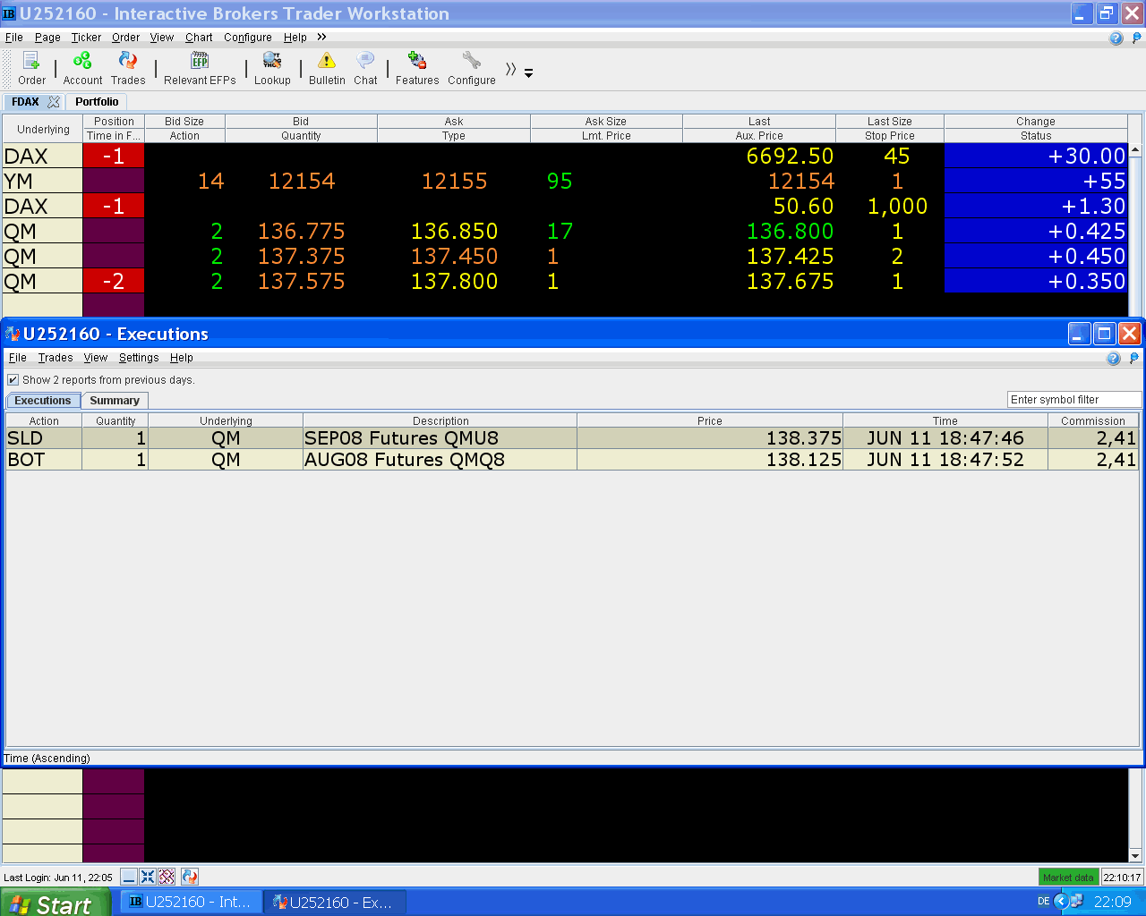 el lado positivo de la subida del petróleo es que mientras el precio esté alto no tengo que preocuparme por el DAX. El contrato de agosto que me quedaba lo cambié hace un rato también por uno de septiembre, ahora los dos que tengo son de ese vencimiento.