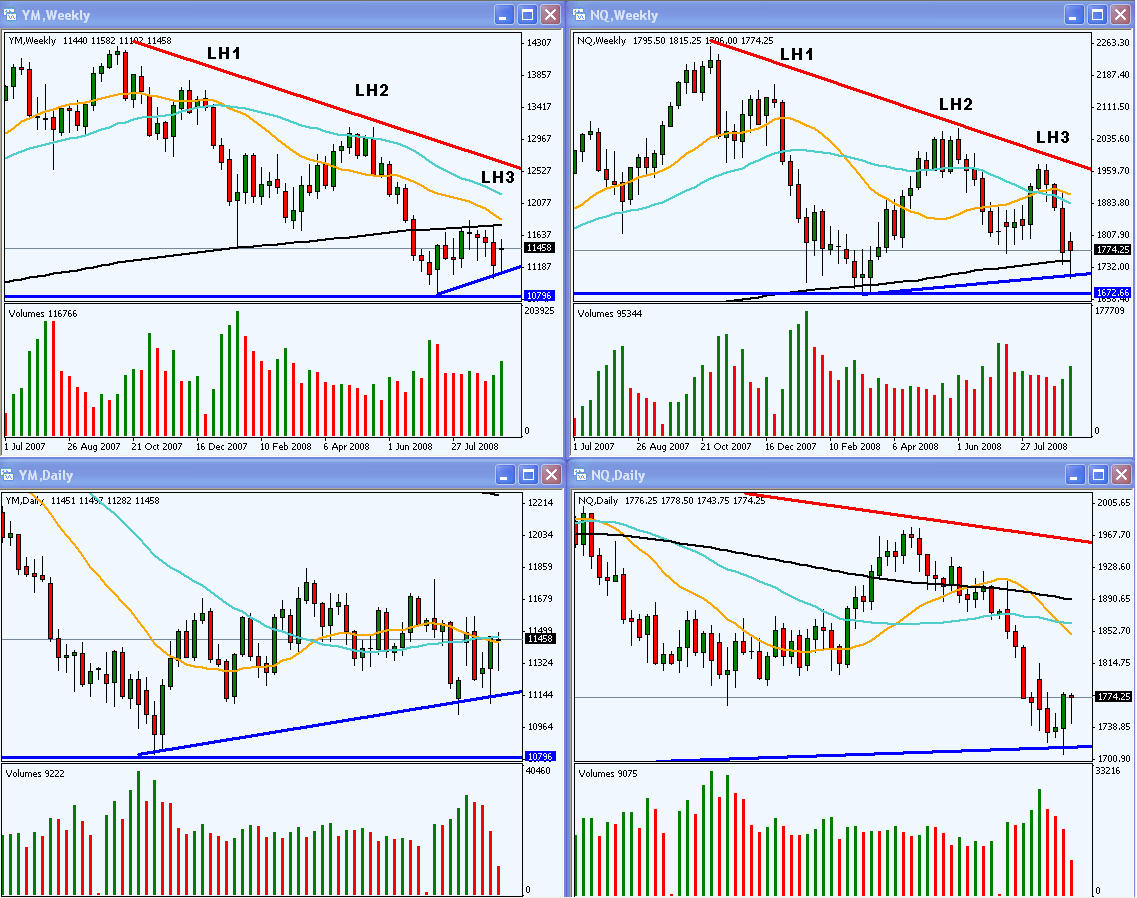Funcionaron los soportes esta semana siendo respetados y generando el jueves un suelo importante con volumen. Mientras no se rompan los mínimos de dicha sesión, bien se podrían mantener posiciones largas buscando el tan ansiado rebote que nunca prospera. Por fortaleza relativa a los que seguís el blog, sabeis que recomiendo el Nasdaq para intentar los largos. La cola de suelo por encima del 200 ma en la semanal confirma el doble mínimo que en caso de ser respetado tendría un primer objetivo en la zona de 1960.