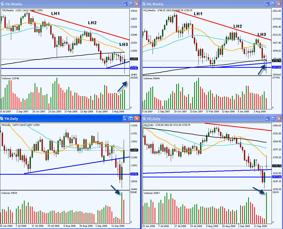 Para que luego digan que ¡¡¡NO hay manipulación en los mercados!!!, lo sucedido esta semana es para escribir un libro, ¿no?. Lo que está claro es que éste es un negocio inventado y creado para que siempre se suba. Ayer consultaba un gráfico histórico del Dow Jones desde su creación por el 1.900 en velas anuales. El famoso Crack del 29 no fueron más de 3 velas rojas para después de un periodo de consolidación formando un suelo, retomar la senda alcista. Y el Crack del 87 fue una triste vela anual totalmente negada al año siguiente. En fin sólo unos cuantos ejemplos de cómo funciona esto.