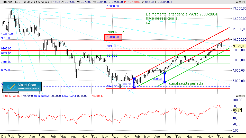 no es mi intenci0n corregirte pero...no tengo npi de a d0nde vA el IBEX...lo del 10000 es un objetivo q marca el grAfico de fuerte resistencia y q de darse un pekeño impulso alcista de nuevo lo colocan ahí trankilamente oil(e ipcs) y tipos el 22 mediante...por mi parte ia te digo, el q tenga o no tenga q iegar a eios no estA en mi mano por lo tanto no puedo io decir si los harA o n0 : ) y en cuanto al lado "pabajo" del grAfico...la verdA...1000 puntos de IBEX...uf...al menos desde los precios actuales (9300) con bastante sobreventa en unos cuantos indicadores y doble mínimo de momento...con los 9140 q de ser esto alcista actuarían de soporte...así como los 8900...q aparte serían la base del canal...esto nos deja 400 puntos desde los 9300..y weno...si se salta a la torera todos estos niveles y no para...weno...tendría pinta de ser algo + q una "correcci0n"...pero de nuevo taríamo haciendo aki de adivinos con lo mal q sale esto luego... : )