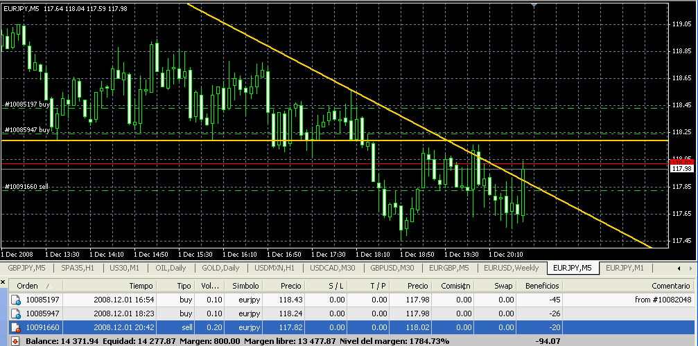 Miro el gráfico y veo que ha recuperado hasta 117,70 para darse la vuelta a 117,50. Debo decidir si abro o no una posición sell para cubrir las buy y sobre todo, si no lo hago ¿Donde debo abrir esa posición por "imperativo legal"?
