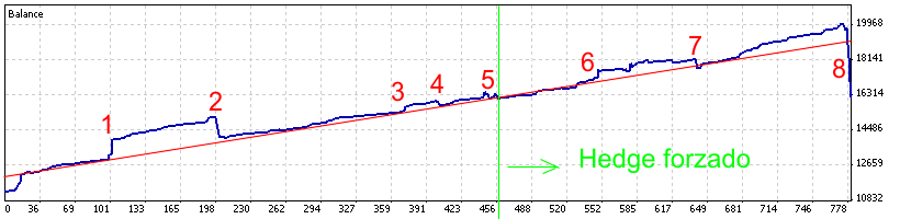 La conclusión más evidente que extraigo es que es mejor cerrar todo el hedge en el momento que un nuevo balanceo exija tomar un margen dispuesto por encima de cierto % de la cuenta. Debido a la imposibilidad de hacer back-testing, ese % lo debemos estimar. Además también depende del perfil de riesgo del trader.