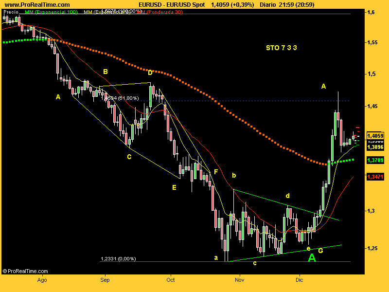 Pues Spirit, el rango me paice que va a ir descendiendo: tiempo ha que dije que esta caidita tan vertical normalmente debería ser la onda A de un triángulo. O eso o se iba todo al carajo con esa velocidad :lol: Caso de que se fuera al carajo, me importaría un ídem estar ekivokao con que me quedo con la lectura primera: esto es un triángulo contracto. Si esto es así, llegaremos probablemente casi hasta el 1.60 y luego otra vez pabajo, pero ya más despacio y menos lejos jejeje...todo ralentizándose poco a poco...los que hemos vivido esto del desenfreno nos vamos a aburrir :lol: Pongo mi recuento del euro y si alguien se molesta en compararlo con el euroyen verá que son mu parejos...