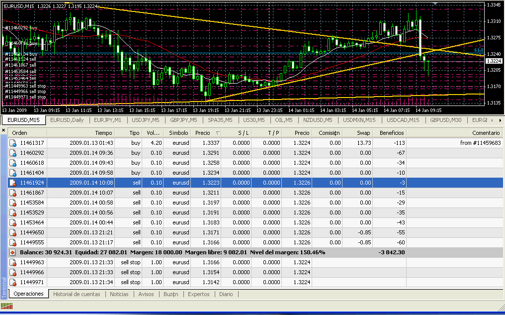 Ayer acerté con no meter una cobertura gorda en los momentos de pánico, siempre prefiero arriesgar unos pipos pero ir cubriendo poco a poco por si el precio se da la vuelta no me deje con dos posiciones tremendas alejadas en los extremos y el precio en medio, en tierra de nadie, ahora tengo muchas posiciones sell abiertas pero las de mayor volumen están cerca por lo que tienen mucha probabilidad de ser cerradas.