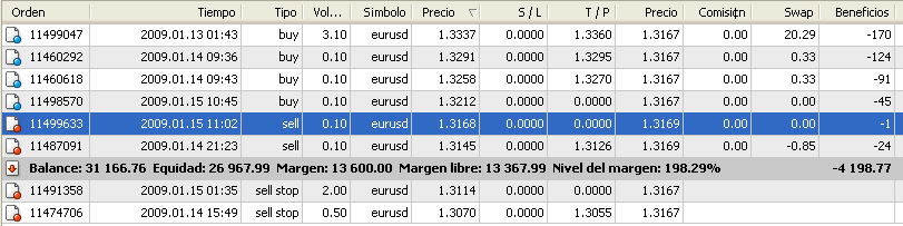 En cambio las posiciones sell admiten muchos criterios de entrada. Pueden ser discrecionales basándose en múltiples razones distintas y nunca tienen por que ser las mismas. La base de las sell (en este ejemplo) es cubrir en mayor o menor grado la pérdida de la buy gorda, dependiendo de la situación en cada momento. Por eso no es necesario buscar puntos de entrada muy fiables, sino medir bien el volumen empleado en función del riesgo que corremos en cada situación.