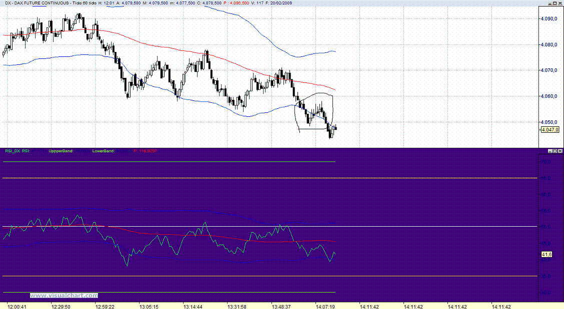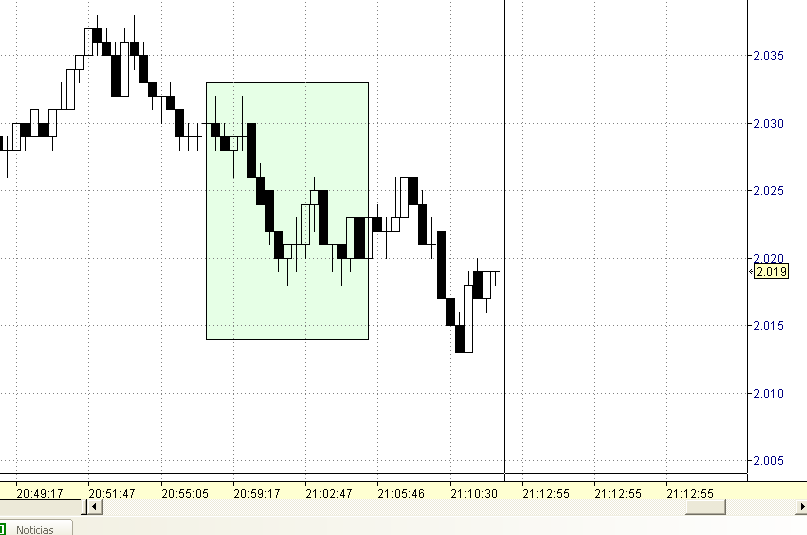 Si a continuación se sale de ese espacio de trabajo y vamos a otro (o bien cerramos el programa), cuando volvemos al espacio de trabajo inicial (o volvemos a encender el programa) nos encontraremos con que lógicamente aparecen nuevas barras en el chart del tiempo que ha transcurrido mientras, pero además oh sorpresa¡¡ resulta que hay cambios en las barras que ya estaban anteriormente. Fijaros en la subidita contratendencia que marco en el círculo y podeis ver la diferencia que hay entre los dos charts. Cuando debian ser exactamente iguales. Y claro, asi no hay quien opere con tranquilidad de que lo que ves se corresponde con la realidad.