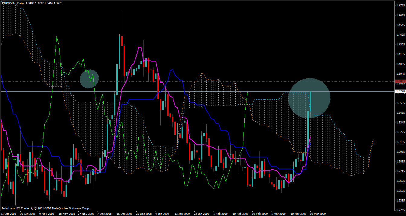 Tal y como comenté en mi anterior post, en caso de romper la nube (kumo) por arriba, cosa que ha hecho, el primer objetivo estaba en 1.3700 y ya lo ha superado. Ahora se perfila un nuevo objetivo en daily, el 1.3850 (si cierra por encima de 1.3700).